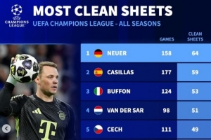 欧冠历史零封榜:诺伊尔居首,卡西、布冯、范德萨、切赫列前五