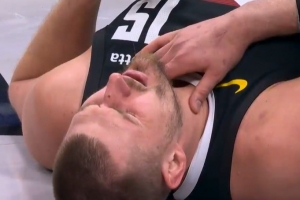 缓一缓!凯尔登上篮时左手无意打到约基奇脖子位置 后者很难受